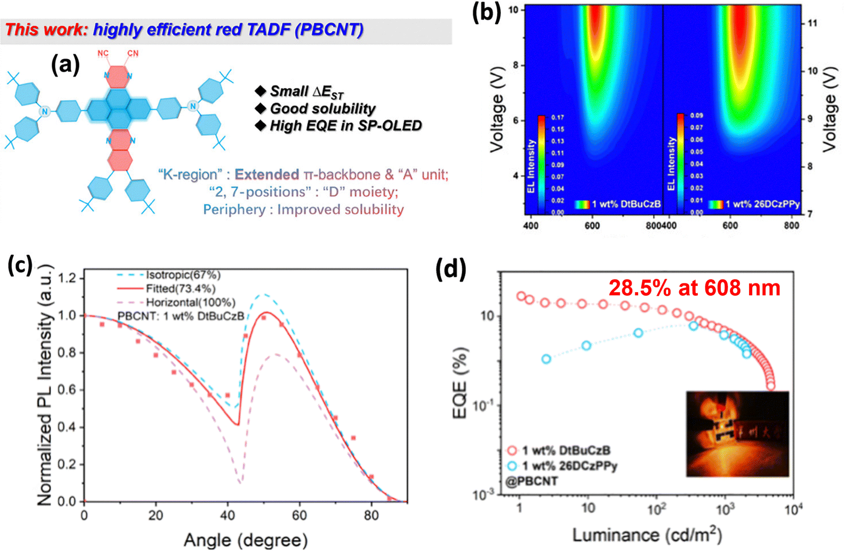 | Fig. 8 (a) Structures of PBCNT, (b) EL spectra of PBCNT devices at different applied voltages, (c) angle-dependent PL spectra of PBCNT (1 wt%) doped in the DtBuCzB film, (d) device performance of the most efficient quinoxaline acceptor-based solution-processable TADF emitter. Reproduced with permission from ref. 69. Copyright © 2025, Wiley-VCH. | ||