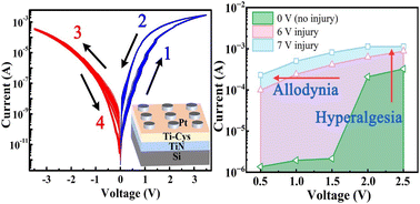 With the rapid development of artificial intelligence, the need to mimic biological functions has become increasingly important for completing complex tasks and adapting to challenging external environments. Memristors, recognized for their biological-like capabilities, have emerged as promising candidates for neuromorphic artificial electronic devices, sparking significant research interest. In this study, we drew inspiration from neurotransmitters in the human brain and selected essential amino acids as organic components to construct biomimetic hybrid films. Using cysteine (Cys) as the organic precursor, titanium-based cysteine hybrid thin films were successfully synthesized via molecular layer deposition (MLD). In situ quartz crystal microbalance measurements confirmed that the MLD process of Ti-Cys followed a self-limiting surface reaction with a growth rate of approximately 0.29 Å per cycle at 135 °C. The stability of the hybrid films was extensively examined, demonstrating excellent durability in both water and air. The potential of these biomimetic hybrid films as resistive functional layers was also explored. A vertically integrated Pt/Ti-Cys/TiN device exhibited reproducible volatile switching behavior, with gradual changes observed during the set/reset process. The resistive switching mechanism of these Ti-Cys hybrid-based devices is mainly governed by charge trapping and de-trapping processes. The volatility of the hybrid memristor devices originates from the trapped electron relaxation/diffusion from shallow traps after the removal of the external bias. Notably, the device successfully emulated bio-pain sensation and synapse functions, indicating that these biomimetic hybrid films hold great potential for the development of artificial sensory systems.