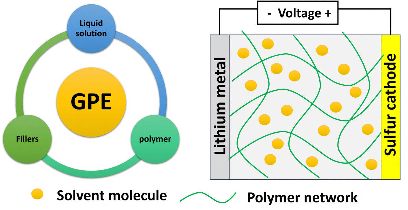 Though SPEs deliver high safety advantages in the absence of any liquid components, they have limitations like low interfacial stability and low ionic conductivity. Hence, GPEs are introduced to bridge the gap between SPEs and liquid electrolytes. They possess good mechanical strength due to a solid polymer matrix and high ionic conductivity of a minimal liquid component used as a plasticizer. Liquid electrolytes in GPEs help in improving both polymer chain mobility and ionic conductivity. GPEs offer better compatibility with electrodes compared to conventional SPEs, potentially mitigating interfacial issues like lithium dendrite growth and polysulfide shuttling. A good GPE should allow volumetric changes during charge discharge cycles. Fig. 14 shows the essential components of a GPE. Most of the GPE research focuses on tailoring the solid polymer host, liquid plasticizer, and fillers to achieve a balance between mechanical strength, ionic conductivity, and interfacial compatibility.